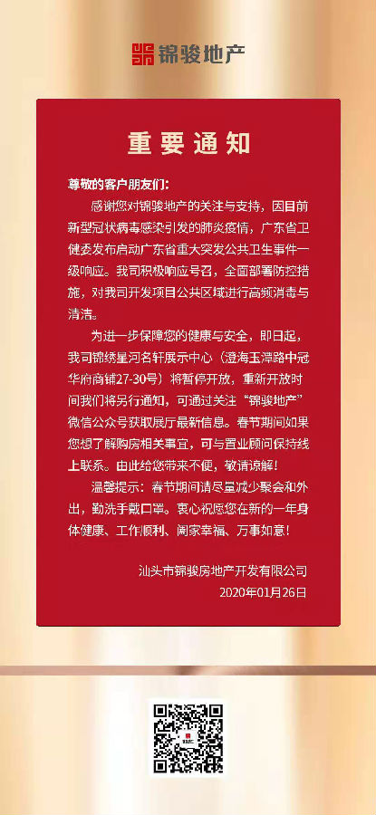 众志成城,防控疫情丨锦绣星河名轩展示中心暂停开放
